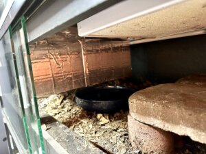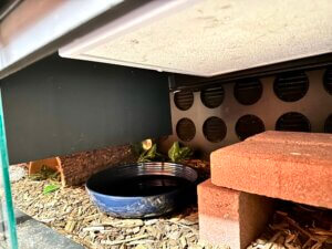 Adding in brick or rough slate to the habitat will be good for their nail maintenance and helps get old skin off during shedding. The bricks should be dispersed throughout the tank but slate can be added under the heat light for a nice basking spot. If slate is added under the basking spot, be wary of just how hot that basking spot gets. A digital laser thermometer is great to have on hand. Don’t need to go crazy expensive.